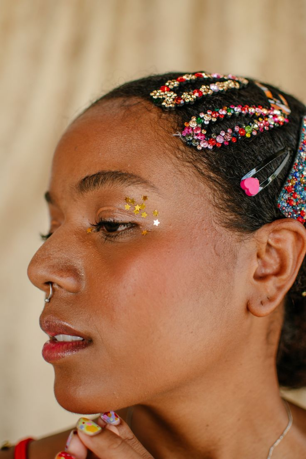 Conforme o look ganha estrutura, pequenos detalhes fazem diferença. Assim, acessórios brilhosos ajudam no equilíbrio visual. Aliás, usar brilho no cabelo pode realçar a maquiagem. Por exemplo, presilhas com cristais adicionam glamour instantâneo.