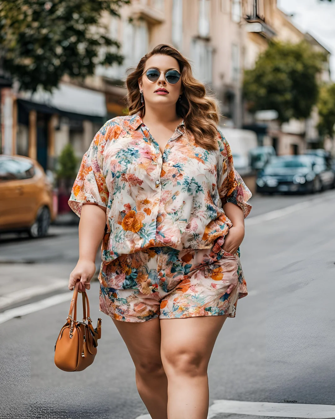 Igualmente, acessórios como bolsas, sapatos e lenços com flores complementam o look, tornando-o mais coeso e elegante. Dessa maneira, cada item contribui para uma aparência harmoniosa e impactante.
